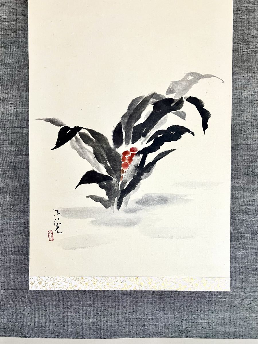 - 【真作】【S8】鈴木秀光「万年青」紙本 肉筆 共箱 花鳥図 茶掛け オモト 絵画 掛軸 大正-現代の日本画家 静岡の人 師: 野島青慈