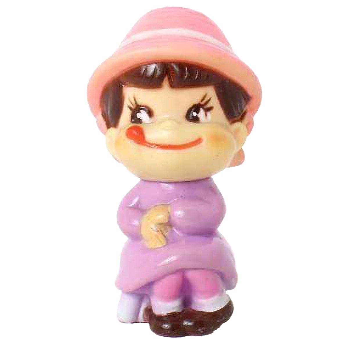 - 不二家 お座り ペコちゃん 紫ワンピース ピンクハット ソフビ 笛 人形 約9cm NT Bランク