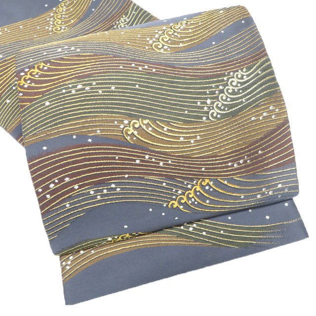 - 袋帯 中古 リサイクル 正絹 フォーマル 仕立て上がり 六通 西陣 祥園 落款 波文 金銀糸 鉛色 多色 きもの北條 A1281-14