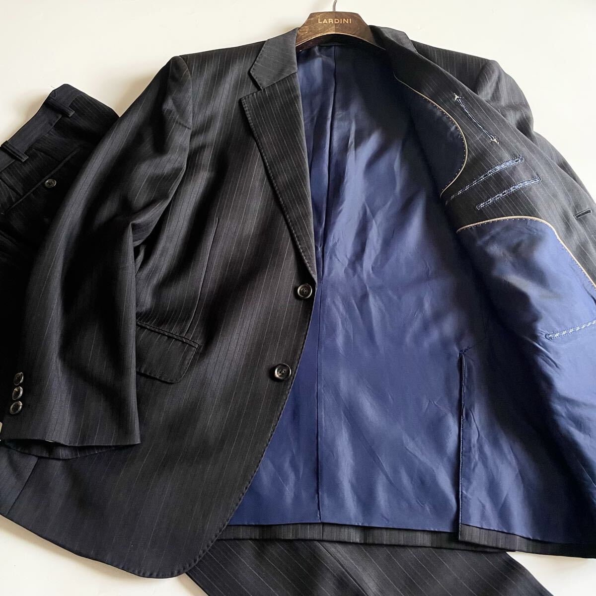 > ErmenegildoZegna ゼニア エレクタ生地 ウール100 ブラック ストライプ柄 セットアップスーツ BB4 L相当 大きめサイズ 裏地ネイビー 紳士服