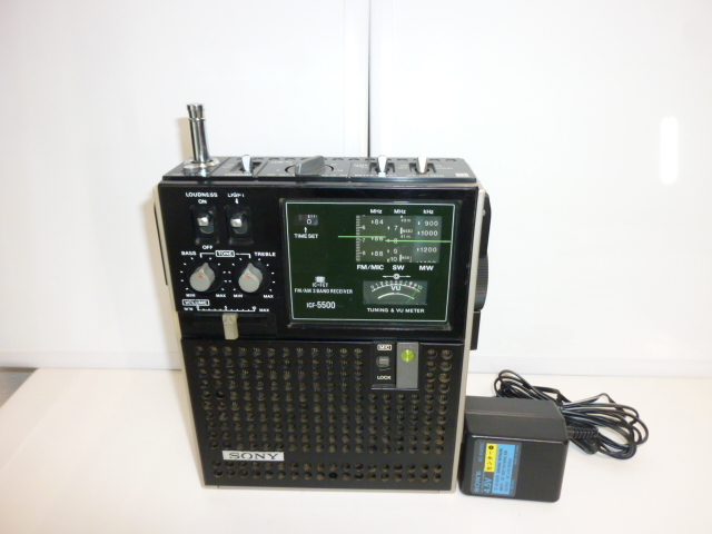 sony ICF-5500です。FM.MW.SWの受信確認が出来ました。アンテナポップアップ、ライト、TONE調整、LOUDNESS、AFC/MW SENS、メーター、タイマー(ゼンマイ式の為正確性の保証は出来ません)OK、電池室もきれいです。付属品はsony製のACアダプターのみになります。全体的に綺麗な状態ですが古い商品のため、擦り傷、汚れ、へこみ、サビ、受信感度低下、接触不良、チューニングメーターのズレ等が有る場合も有りますので、ご理解の上NC.NRで宜しくお願いします。発送は80サイズ元払いとなります。