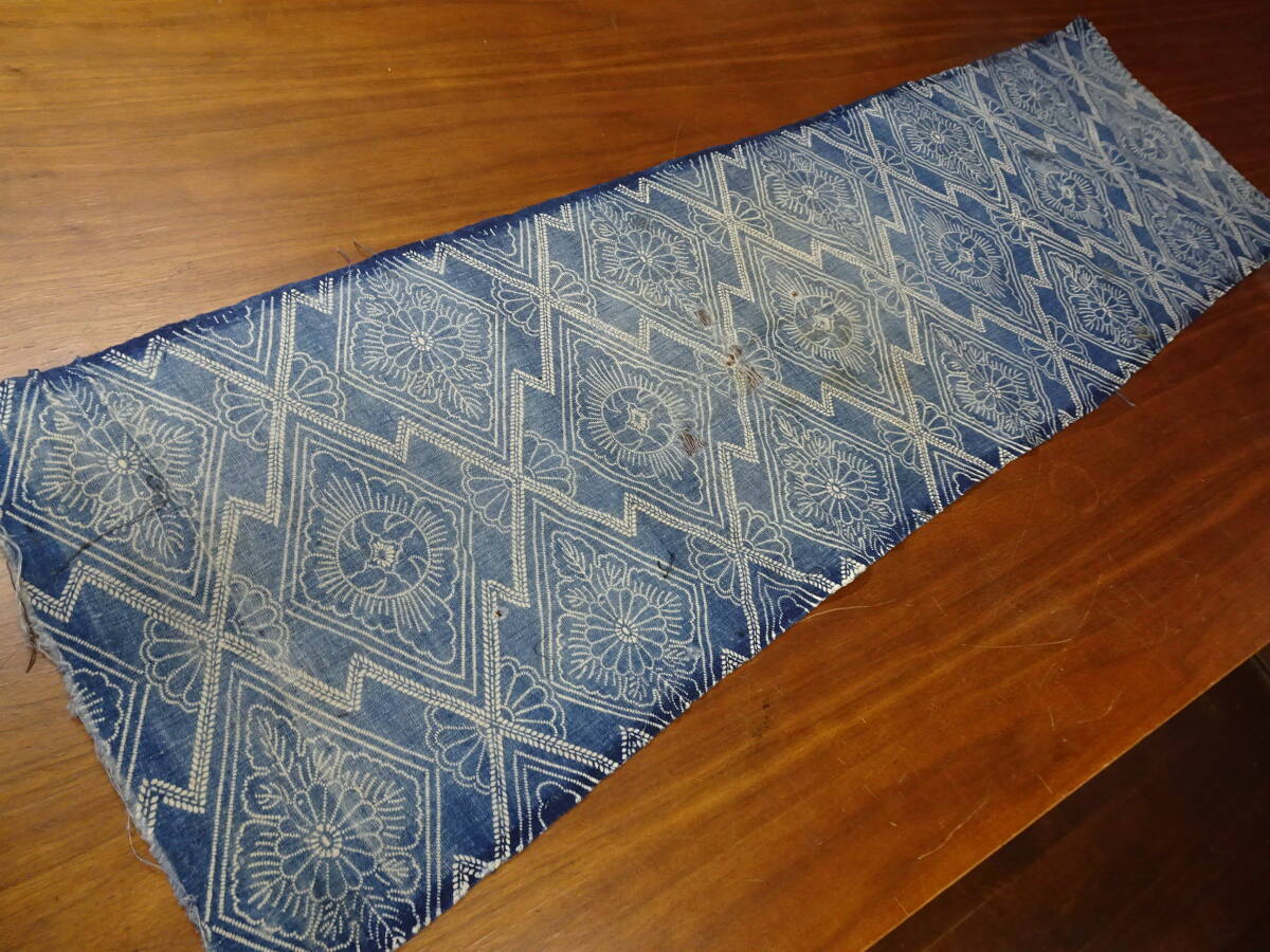 - 1005-3 古布木綿 藍染型染菊 洗濯済 リメイク素材 一巾-120cm