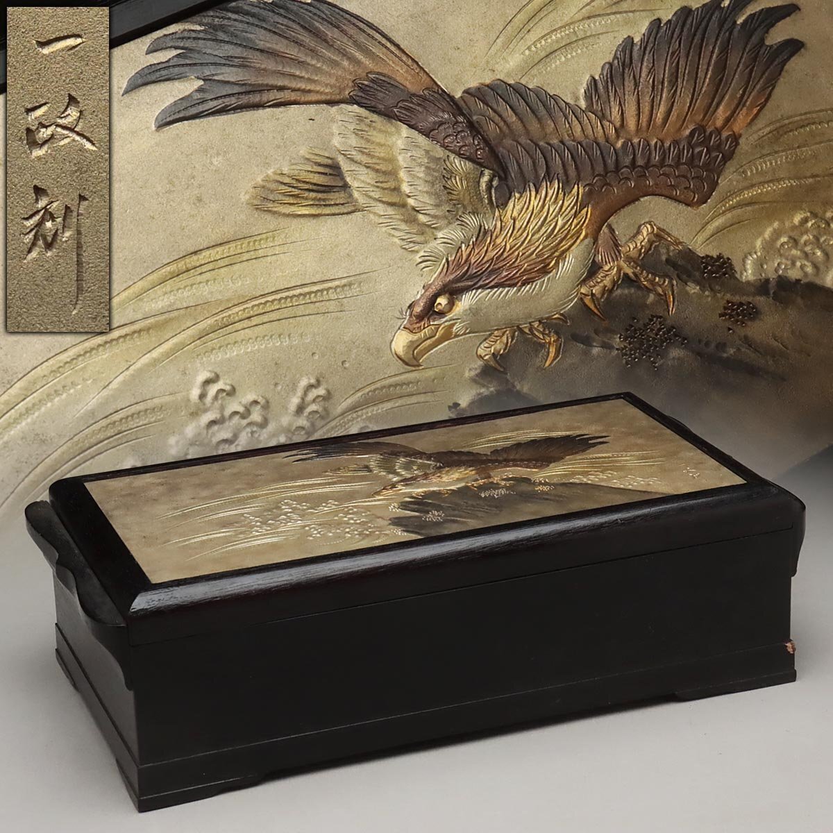 - 時代 喫煙具【一政刻】彫金 金工 波に岩鷹図 煙草具揃 幅24.5cm 重575g 煙草盆 莨具 金彩 作家