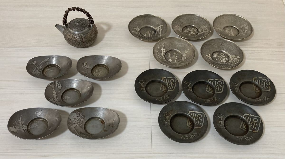 - 錫 古錫 在銘 茶器 まとめセット!乾茂號造 間村自造 錫半 瑞峰 茶托 急須 総重量 1425g 中国 唐物 古玩 茶道具 煎茶 玉露 錫製