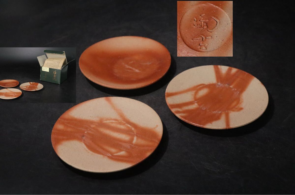 > 小西陶古 備前 火襷 銘々皿 小皿 3客 紙箱・栞付き / 備前焼 煎茶道具 皿 .B1186