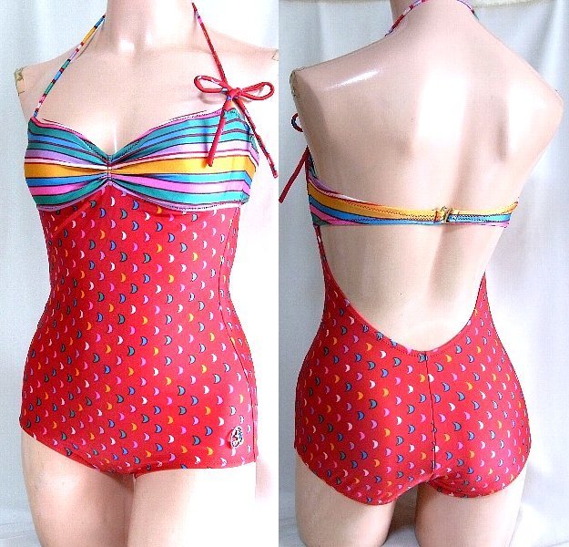- ★☆80年代アイドル系 胸カラフルボーダー&赤ワンピース水着☆★
