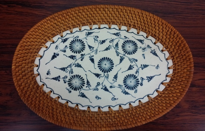 - バッチャン焼き ラタン付きオーバル型トレーLサイズ(青菊柄)
