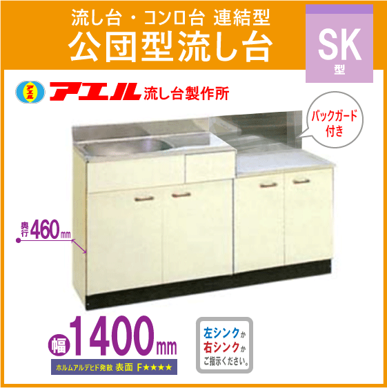 > 公団流し台 連結型流し台(バックガード付) 140cm SK型 SK-1400,BG600 アエル流し台製作所