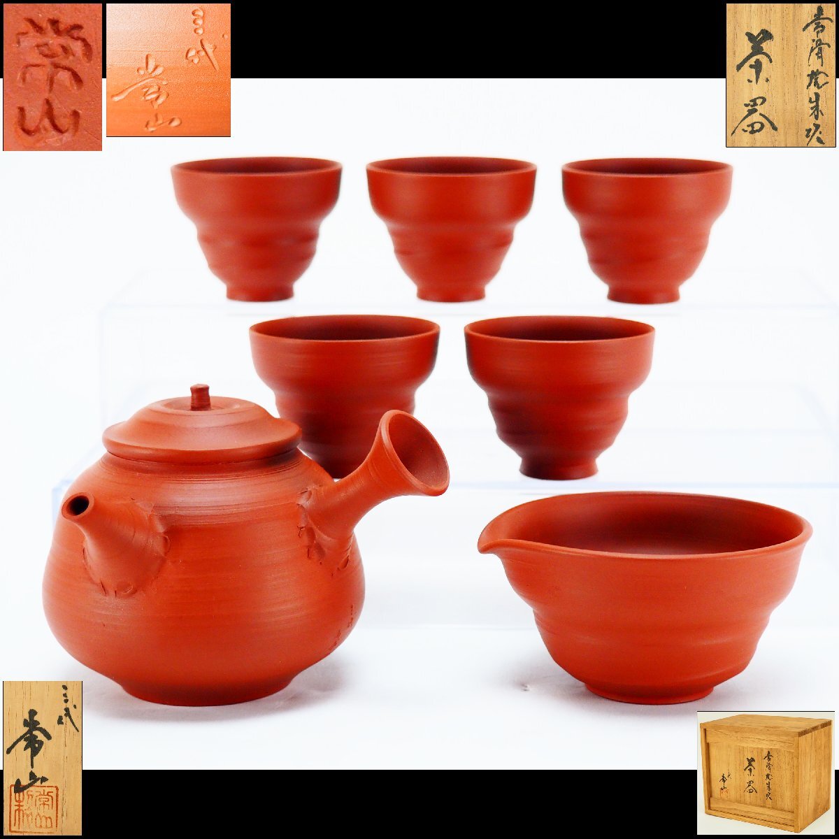 - 【治】人間国宝 三代『山田常山』造 朱泥急須・湯冷・煎茶碗 茶器揃☆共箱 常滑焼 (検索:吉川雪堂 吉川壷堂 山田宝生) 本物保証 OH27