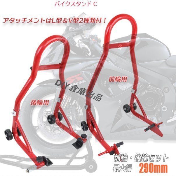 > 【送料無料】★【超お得セット】自宅でのメンテナンスや店舗内の車両展示などもオススメで バイクスタンドフロント+ リア 2点セット【赤】
