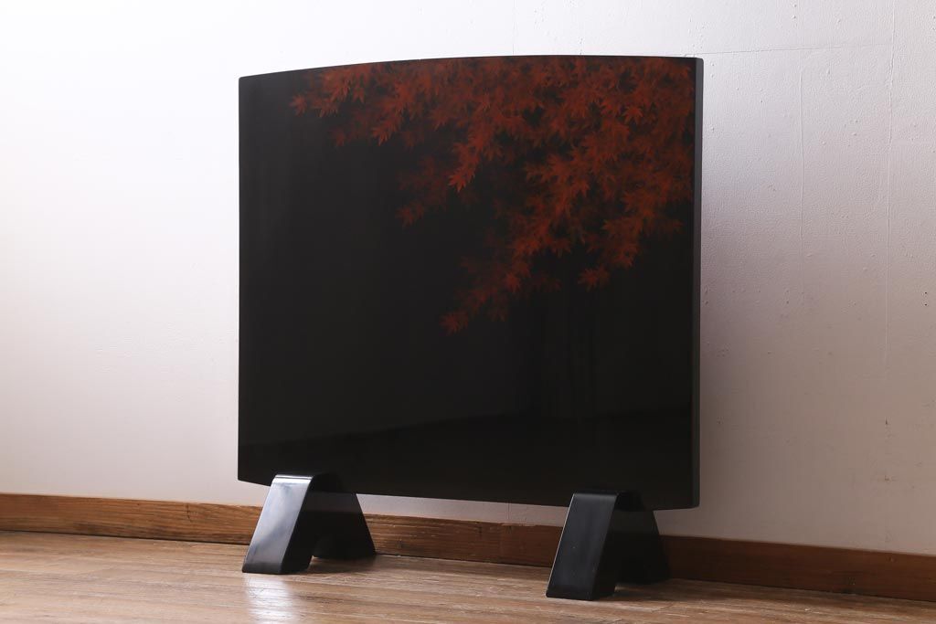 > R-038912 中古 漆塗 広堂作 夕焼紅葉図 朱と黒のコントラストが印象的なつい立て(衝立、パーテーション)(R-038912)