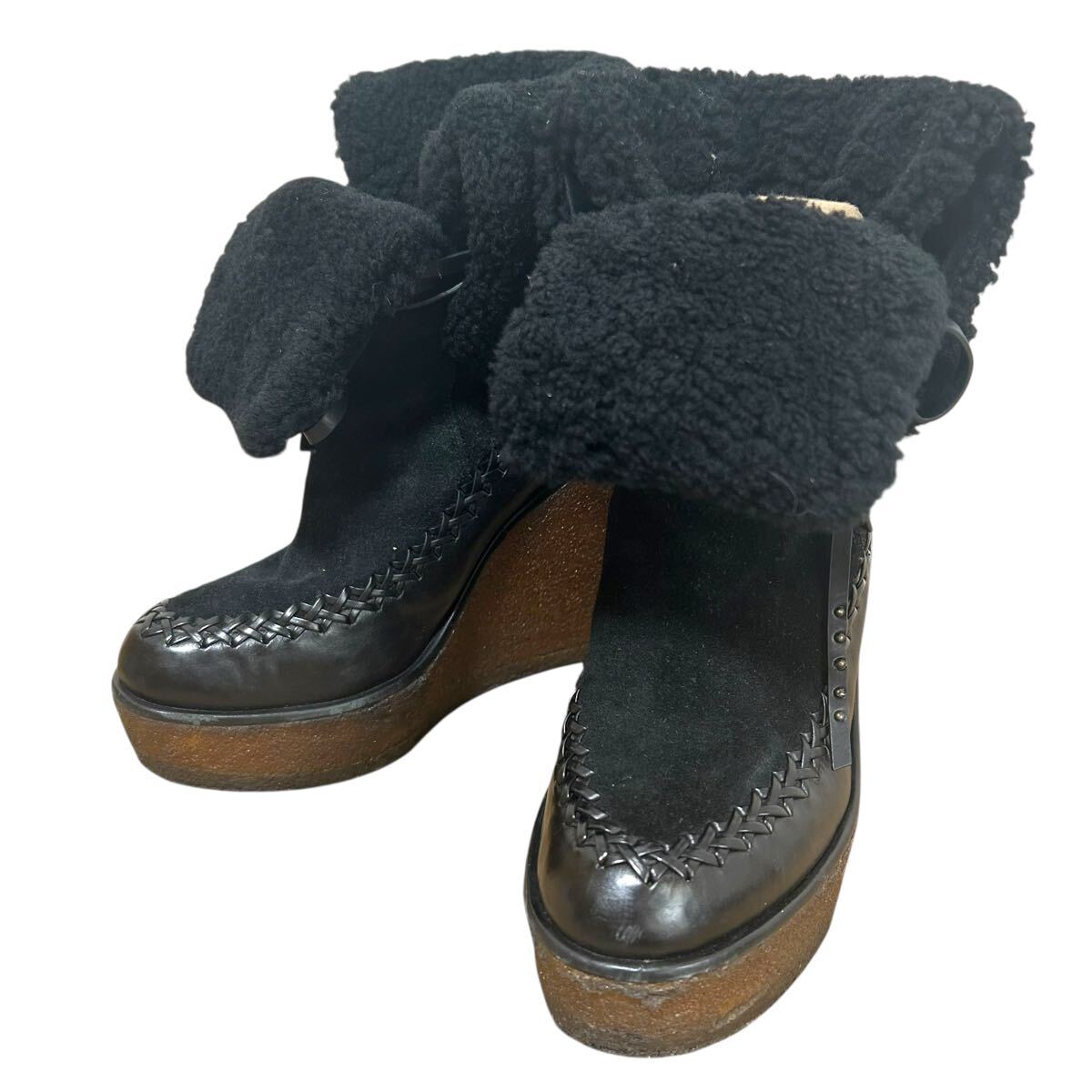 > ※BT1 COACH コーチ レザーショートブーツ スエード ウェッジソール ボア クレープソール ハイヒール ブラック 23.5cm