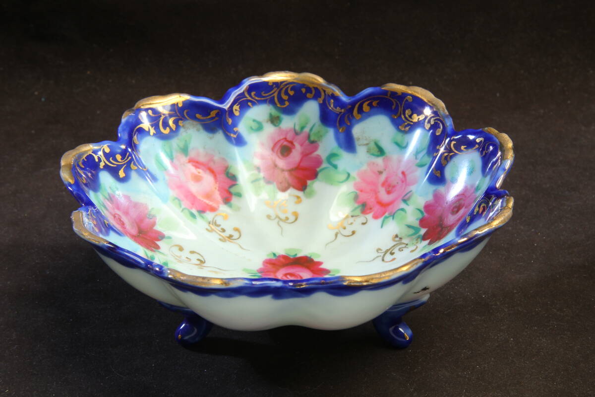 - 701 オールドジャパン ボウル オールドノリタケと同時期 大正頃 三脚座 コバルトと金彩の縁飾り 薔薇模様