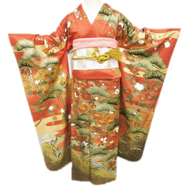 > 振袖 着物 中古 正絹 成人式 結納 金駒刺繍 花の図 松梅 流水 雲 地模様 赭色 多色 金 身丈164.5cm 裄70cm L きもの北條 A1283-8
