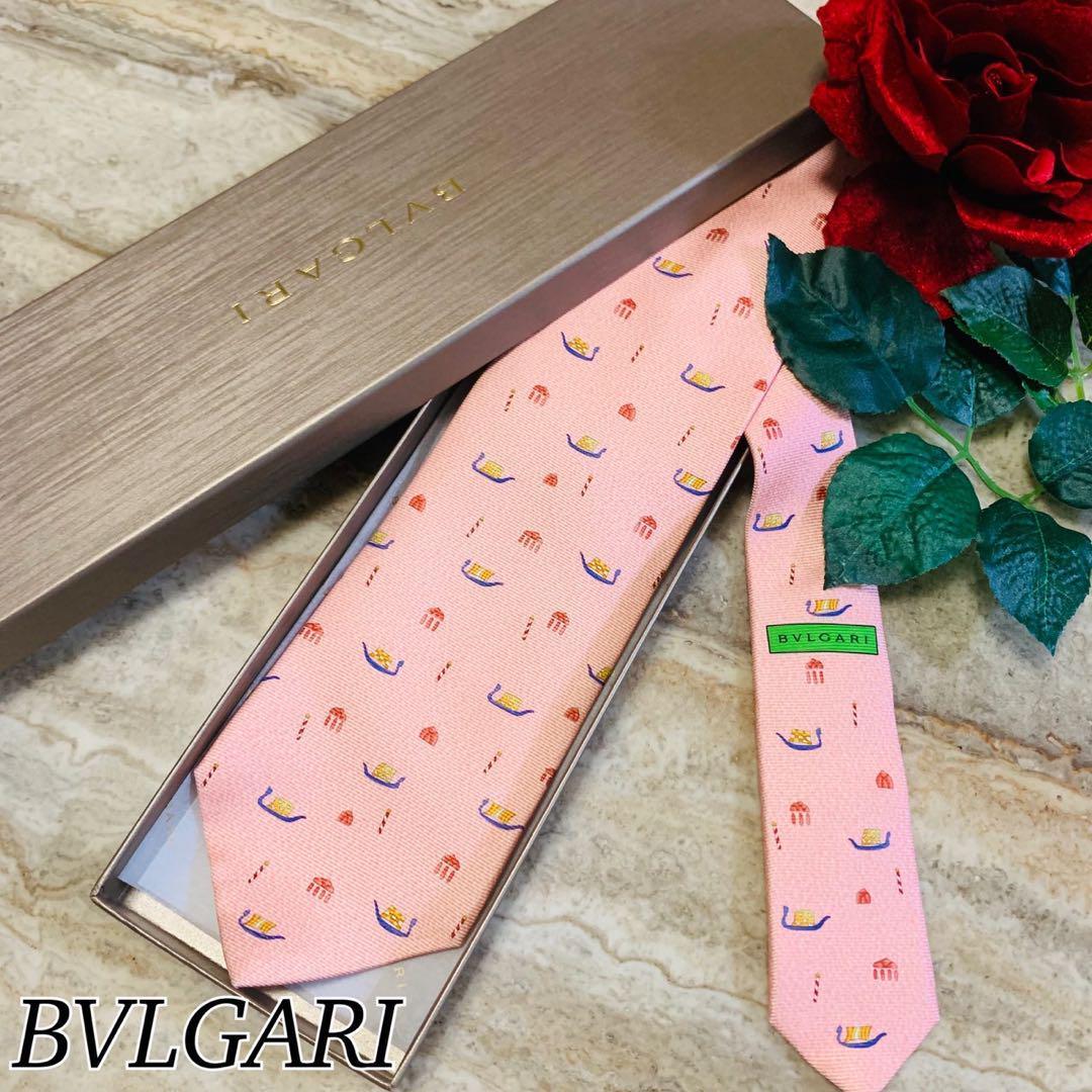 - N76 新品未使用 ブルガリ 船 くらげ 総柄 ピンク ネクタイ メンズ