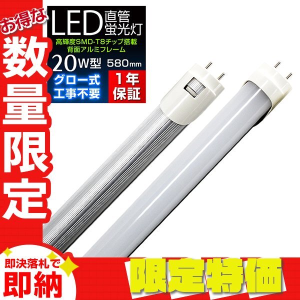 > 【限定セール 送料無料】1年保証 直管LED蛍光灯 1本 20W型 昼光色 580mm 約58cm グロー式 工事不要 SMDチップ LED 照明 店舗 事務所