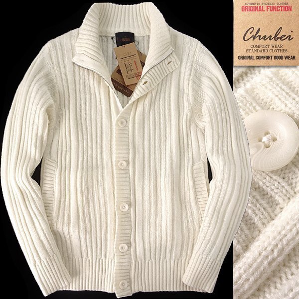 - 新品 チュウベイ ウール混 リブニット カーディガン M 白 【CH434129_7_M】 CHUBEI ウォッシャブル 秋冬 メンズ セーター ボタンアップ