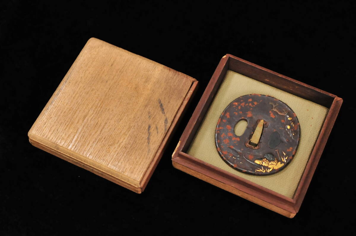 - 【鍔】 鉄地丸鍔 無銘 大黒天盛象嵌 77×72mm 厚み:5.5mm 重量:120g 木箱入り 刀装具 刀 脇差 日本刀 03409001-8