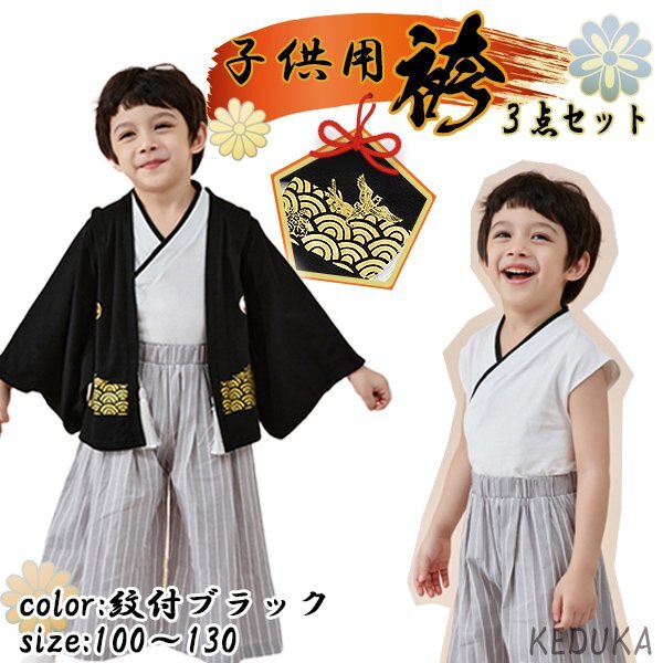 - 子供用 袴 袴風 男の子 紋付ブラック3点セット 房付き 黒紋付 羽織 男の子 紋付袴 和風袴 フォーマル 子供の日 子供服 節句 端午の節句