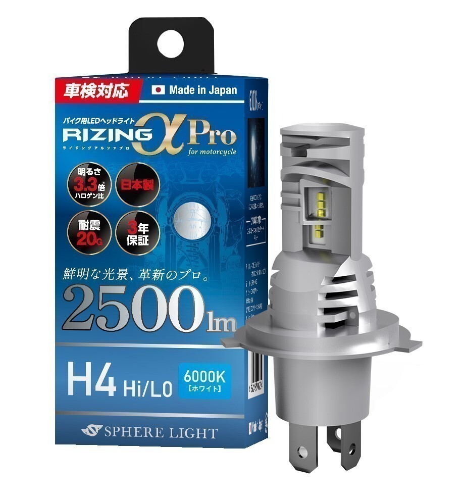 > スフィアライト バイク用LEDヘッドライト RIZINGアルファPro H4 Hi/Lo 6000K 12V用 2500lm 50000時間 日本製 車検対応 3年保証 SLRPBH4060