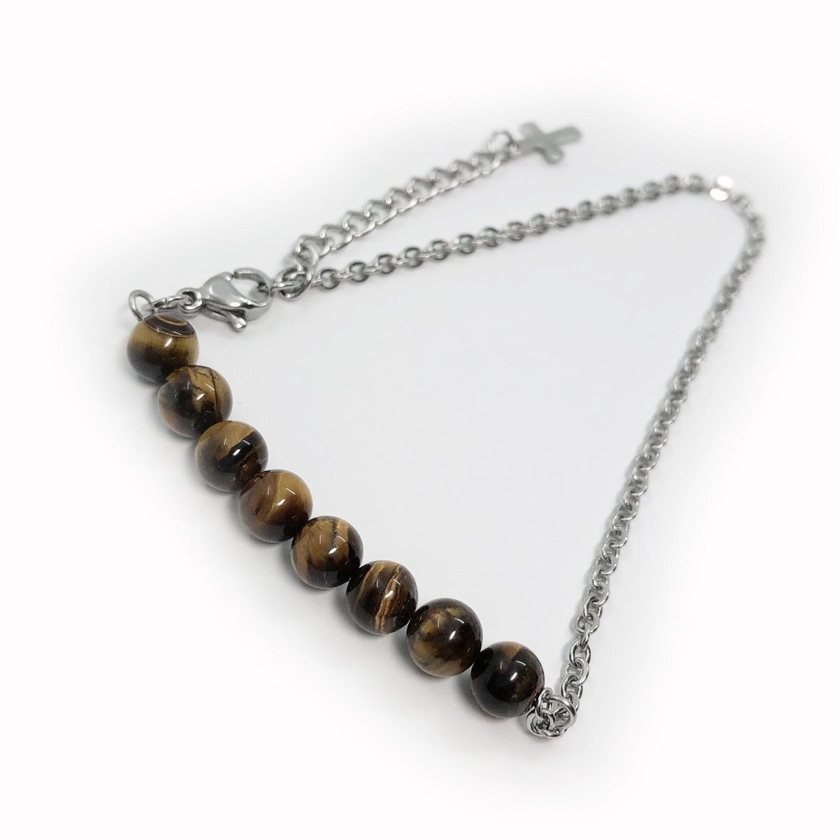 - ステンレスチェーン アンクレット タイガーアイ 6mm玉 平小豆チェーン幅約2.5mm 27cm(23cm+4cmアジャスター) GN43