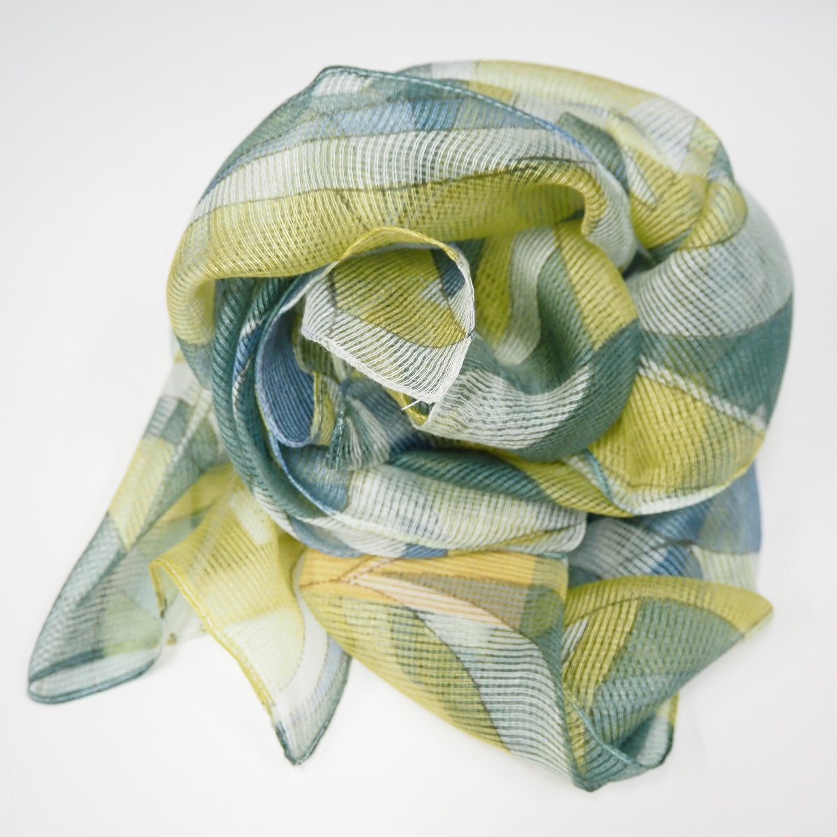 - ストール スカーフ シルク混 ふんわり軽い チクチクしない 23 幾何学模様 グリーン イエロー ブルー