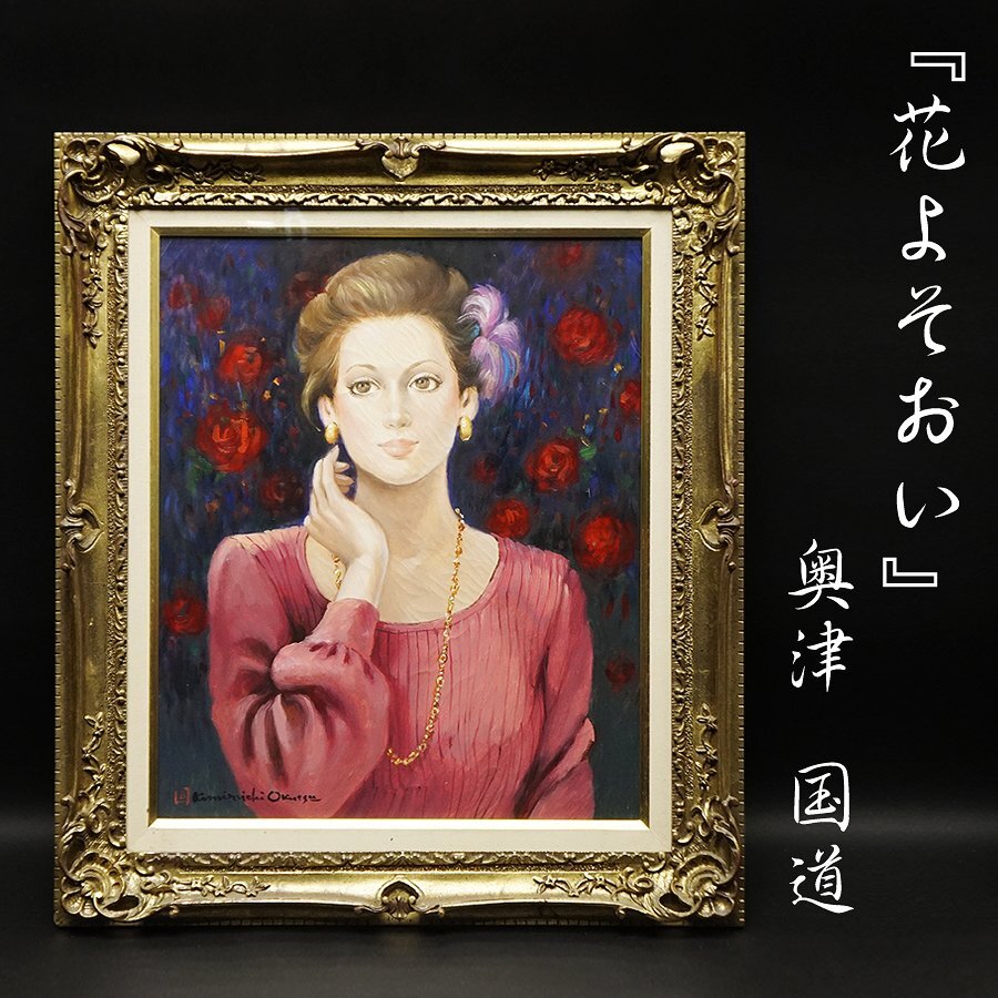 > 奥津国道『花よそおい』8号 写実 油彩 油絵 原画 直筆 人物画 絵画 額装 美術 芸術 アート 裏書サイン有 古美術品 真作保証品