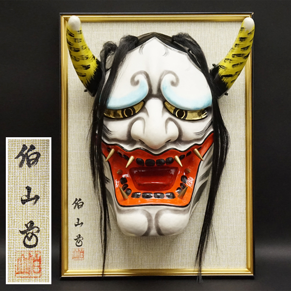 > 特大般若面 鬼面 鬼 開運 在銘 島根県 石州和紙造 石見神楽 東洋彫刻 工芸 縁起物 壁掛け お面 厄除け 時代 骨董 オブジェ 古美術品