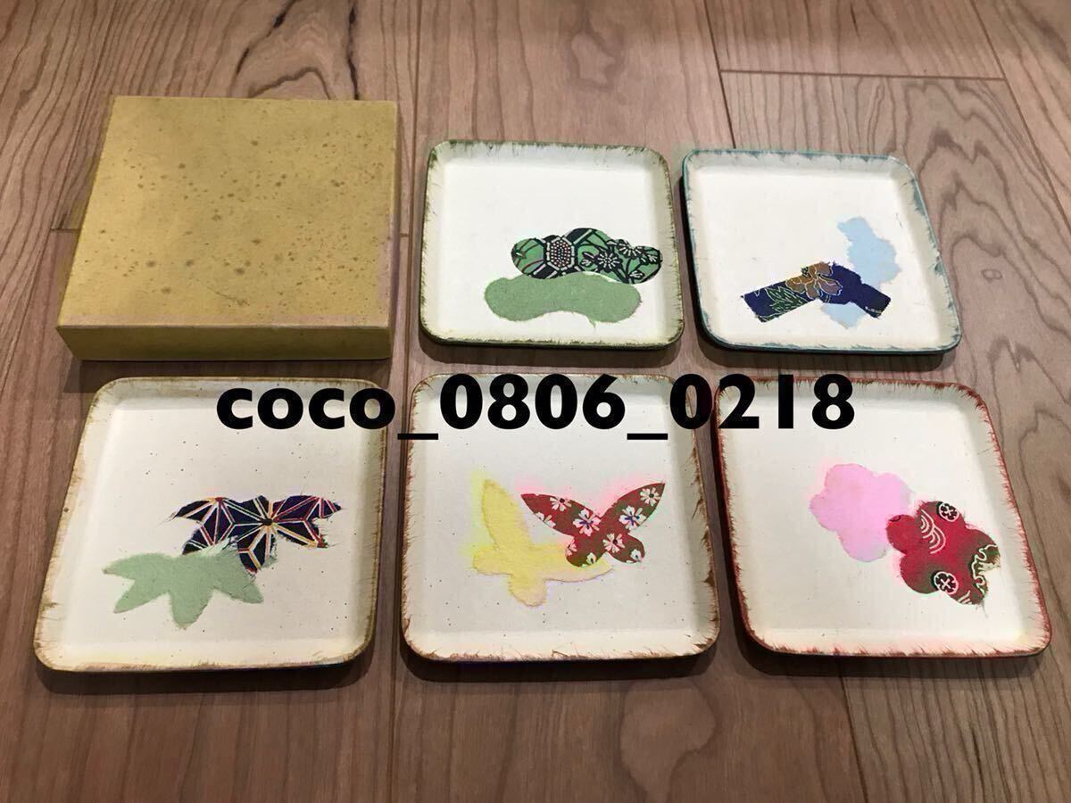 > ♪手すき和紙 工芸皿 角皿 松 竹 梅 蝶 和柄 5枚セット【未使用】長期保管 中古品扱い 経年劣化あり