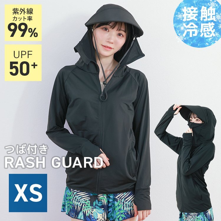 > [在庫処分SALE] UVパーカー ラッシュガード パーカー 接触冷感 レディース 取り外せる つば付き あご紐 速乾 日焼け 水着 XSサイズ 黒