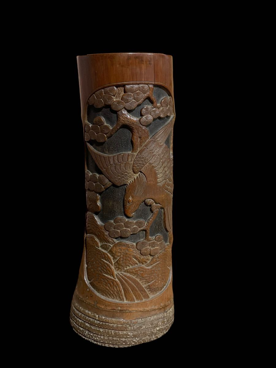 - G14/ 時代 古竹彫 在銘 博稔刻 花入 花器 飾 骨董 古美術 置物 彫刻