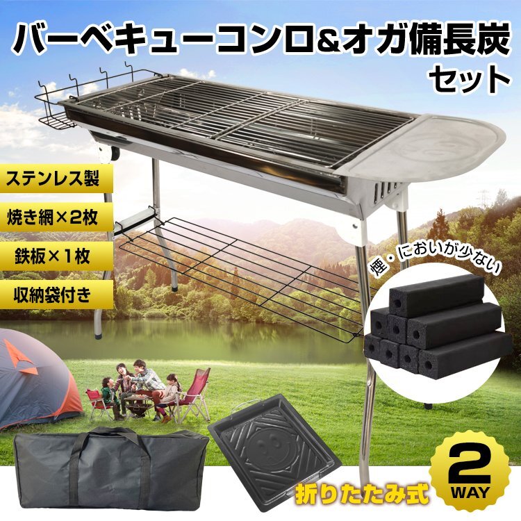 - 送料無料 バーベキュー コンロ &オガ備長炭セット 折りたたみ 炭 BBQ 収納袋付き ステンレス キャンプ 調味料 ラック 焼肉 od453-od636