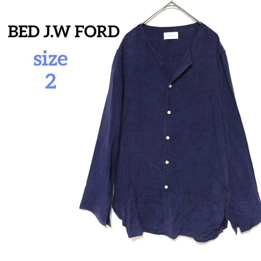 > BED J.W FORD ベッドフォード レーヨンシャツ ノーカラー 長袖 ロングスリーブ 紺色 ブルー ネイビー カラーレス