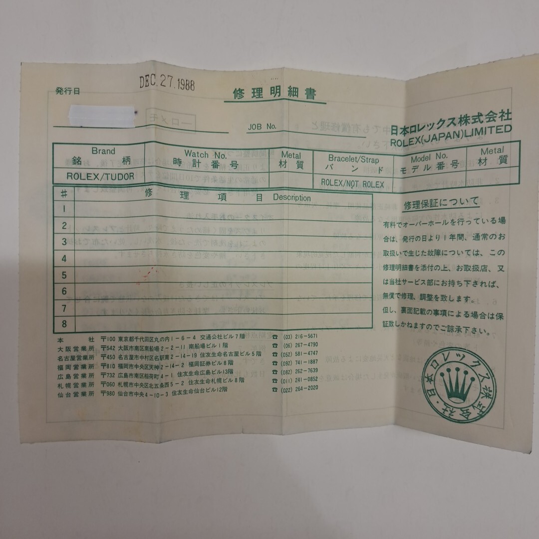 - 1988年12月27日に発行された修理明細書です・・・昔の正規輸入の ROLEX/TUDOR に使用されていました・・・日本ロレックス株式会社