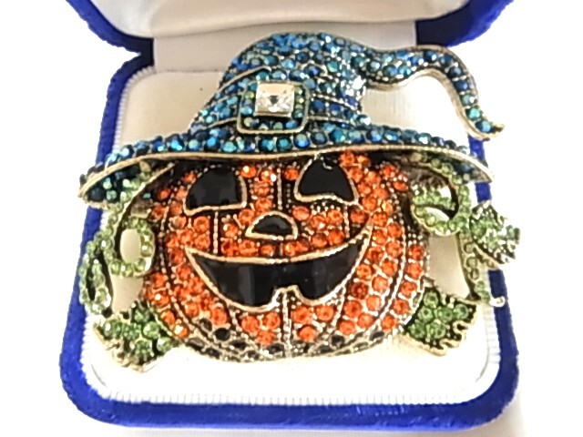 > 新品未使用品 ハロウィンのテーマのデザイン キラキララインストーンが輝くビジュー カボチャと魔女のモチーフ 大き目 ブローチ♯