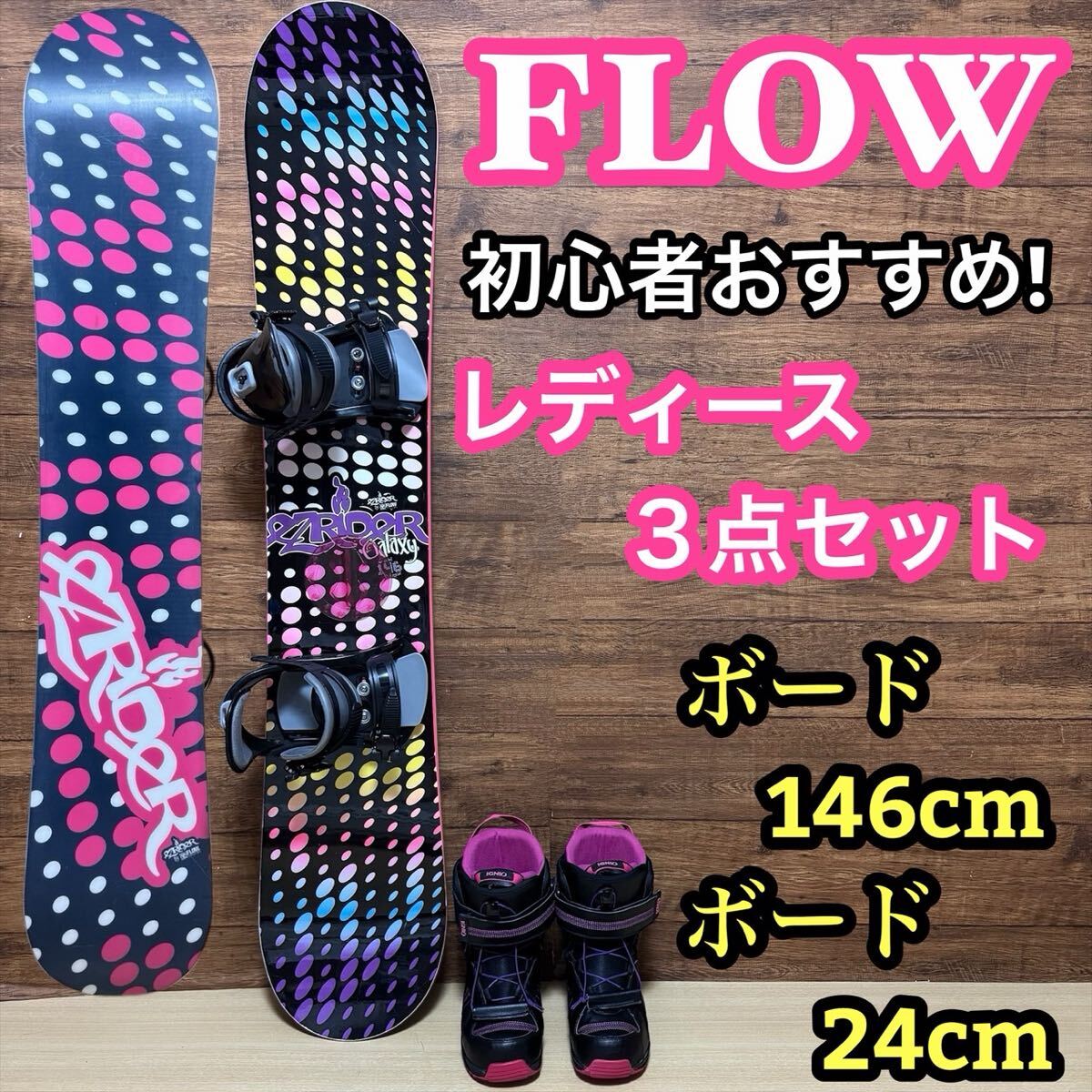> FLOWフロー レディース スノーボード3点セット 初心者オススメ ボード 146cm バインディング ブーツ 24cm メンテナンス済み かわいい