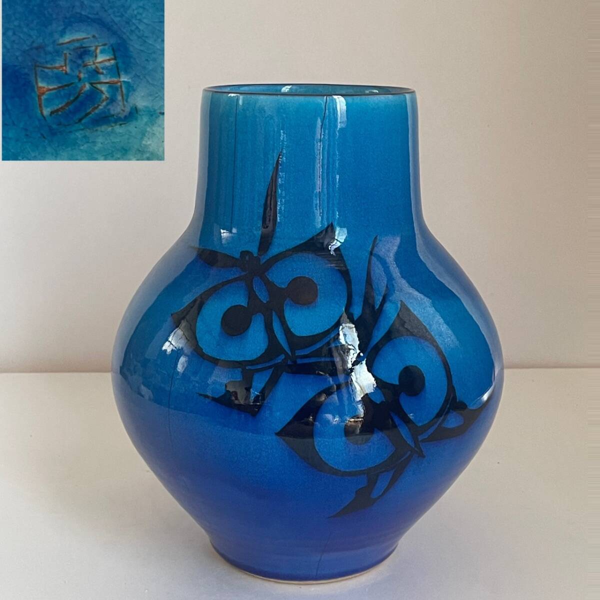 - 【和美】木村芳郎 碧釉蝶文 壺 高さ25㎝ 本物保証 花器 花瓶 80