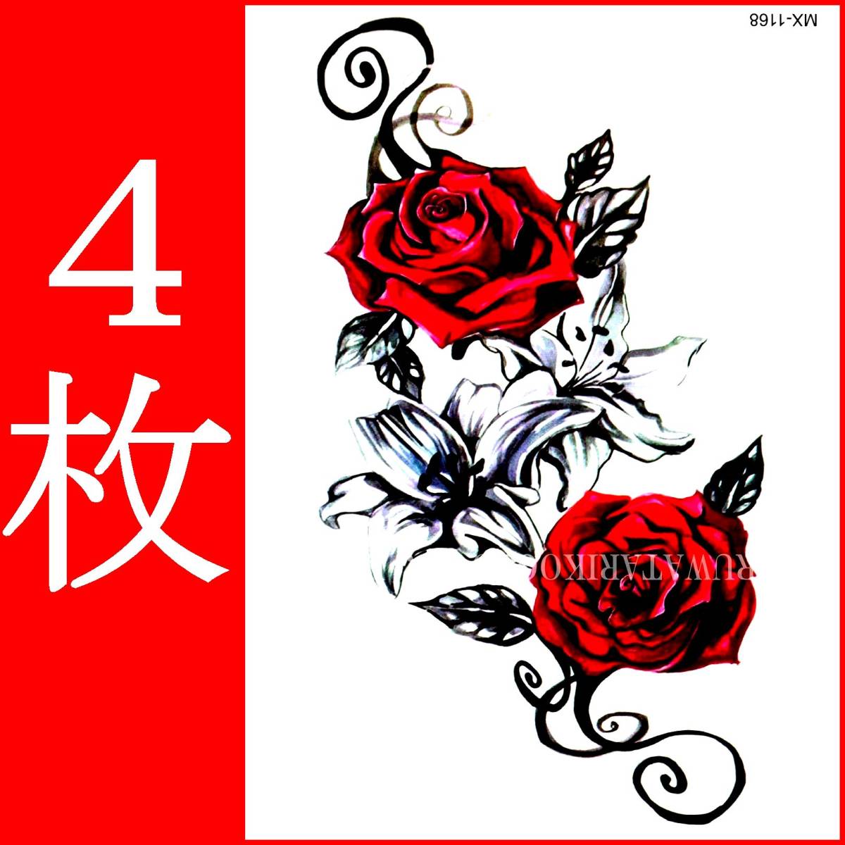 - タトゥーシール 4枚 21X15cm 入れ墨 タトゥーステッカー 消せる刺青 ボディーアート ハロウィン あおり運転対策 コスプレ バラ 赤 百合