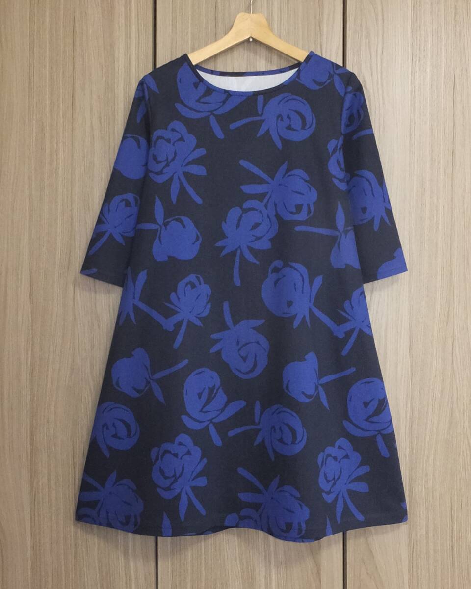 - ♪送料無料 ハンドメイド 綿 起毛コットン 花柄 ネイビー シンプルAラインワンピース♪
