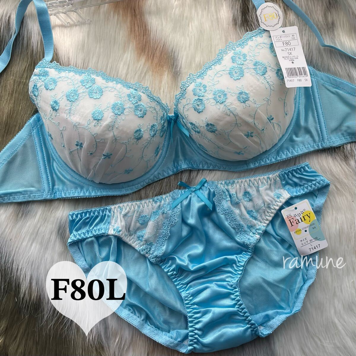 - 【F80-L ブルー 上下】新品 ブラ&ショーツ ブラジャーショーツセット パッド付き 丸胸メイク 花柄刺しゅう かわいいパンティ 女装 Fカップ