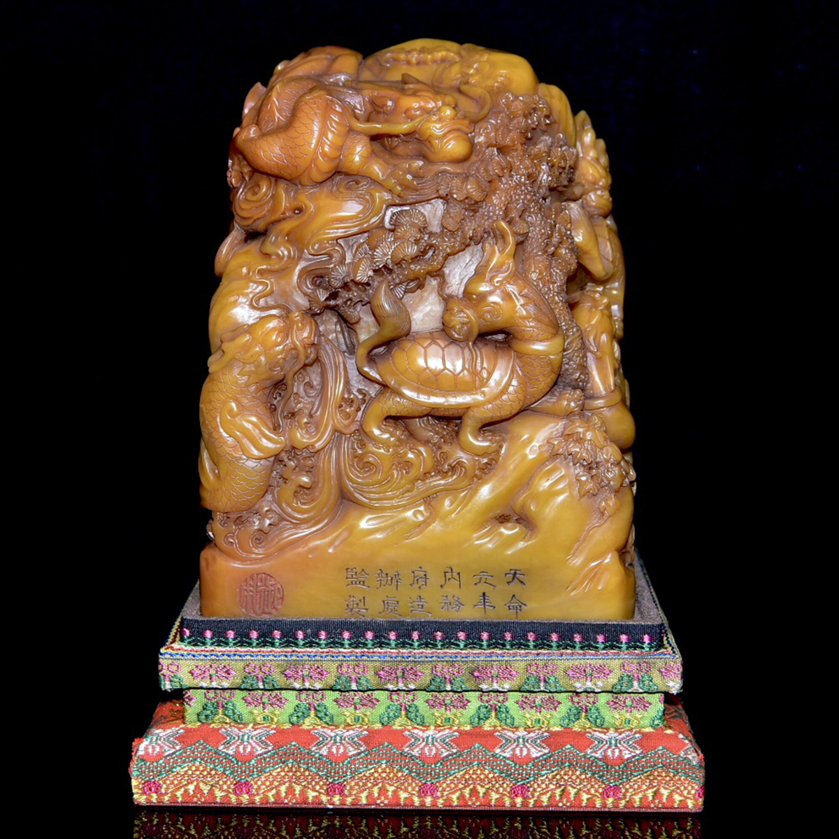 > ▽鴻▽清朝時代 寿山石 田黄石彫 天命皇帝之寶 龍亀瑞獣鈕寶璽印章 天命元年内務府造弁処監製 箱付 時代物 中国古美術 骨董品