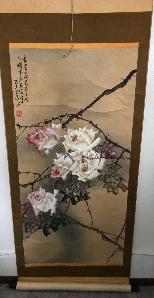 - S332 【模写】掛軸 李源海 絹本彩色画 薔薇之図 花鳥画 肉筆 絵画 日本画 中国美術 古美術 骨董品 シワあり