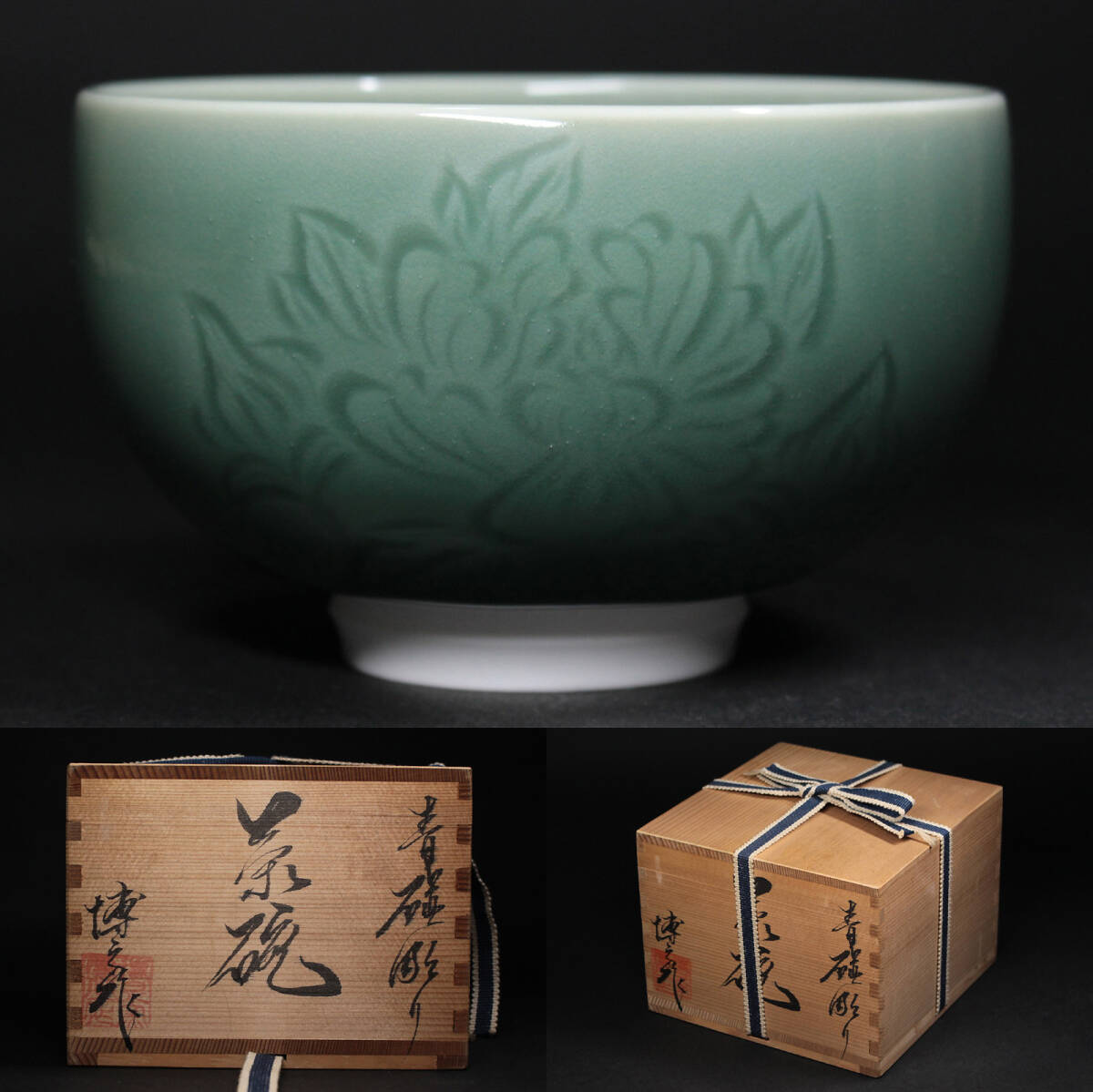 - 松尾博之 青磁彫り 茶碗 共箱 検索: 懐石道具 茶懐石 料理皿 和食器 向付 会席道具 会席料理 割烹 茶事
