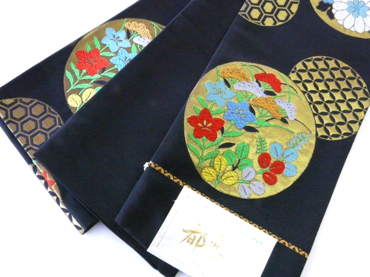 > 正絹 ジュニア半巾帯 日本製 黒 丸紋 未仕立て 七五三 018