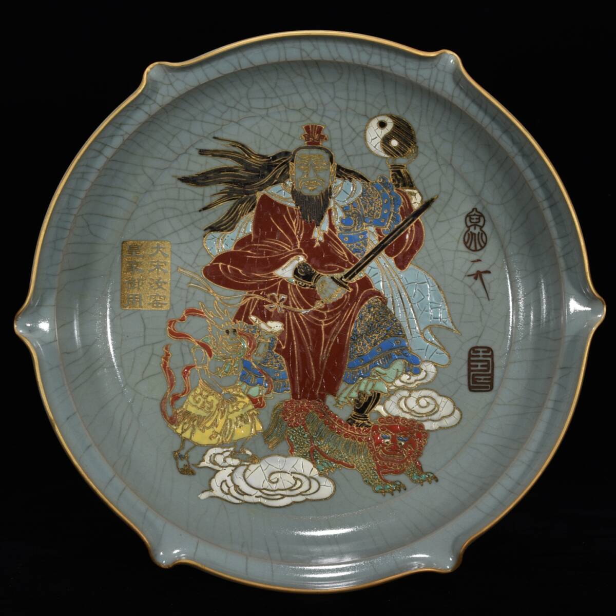 > A_YF0508【惠】人間国宝 中国骨董 陶芸 磁器【宋汝窯蒔絵彩張天師神像人物盤です】工芸品 施釉陶 青花磁 陶芸 置物 收藏品
