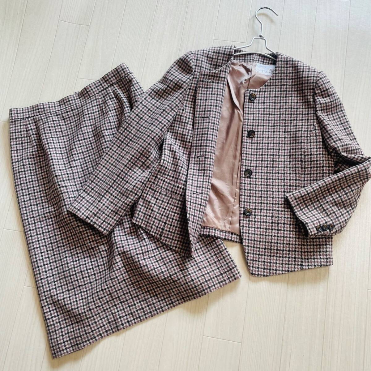 - ほぼ新品 ダックス セットアップスーツ ロングスカート ノーカラージャケット フォーマル ウール チェック 千鳥格子 ピンク系 G0079
