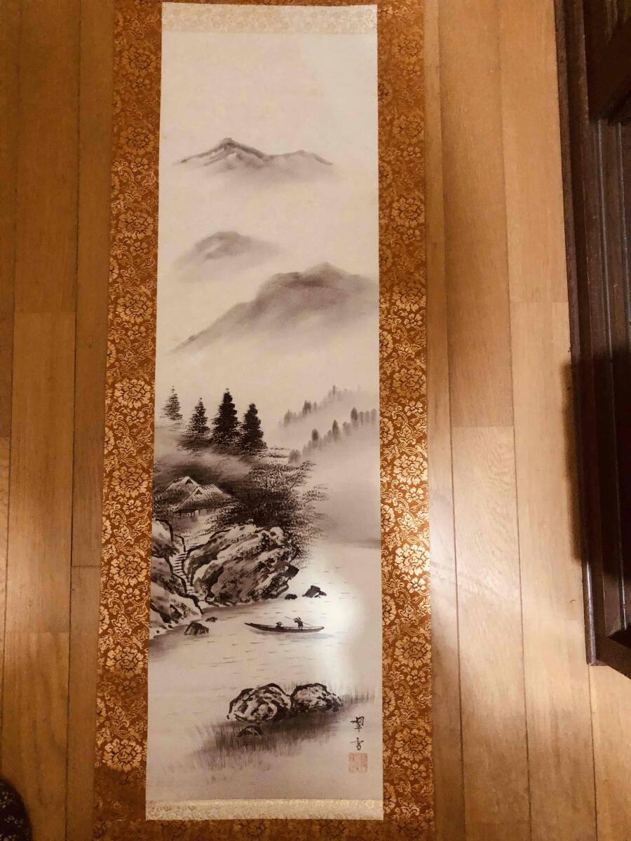 - 【掛軸・真作】平野翠雪 山水画 水墨画 墨絵 絹本 金茶表装 茶道具 骨董 日本画 霧山水 禅 古美術 茶掛け 書画 和モダン 床の間に