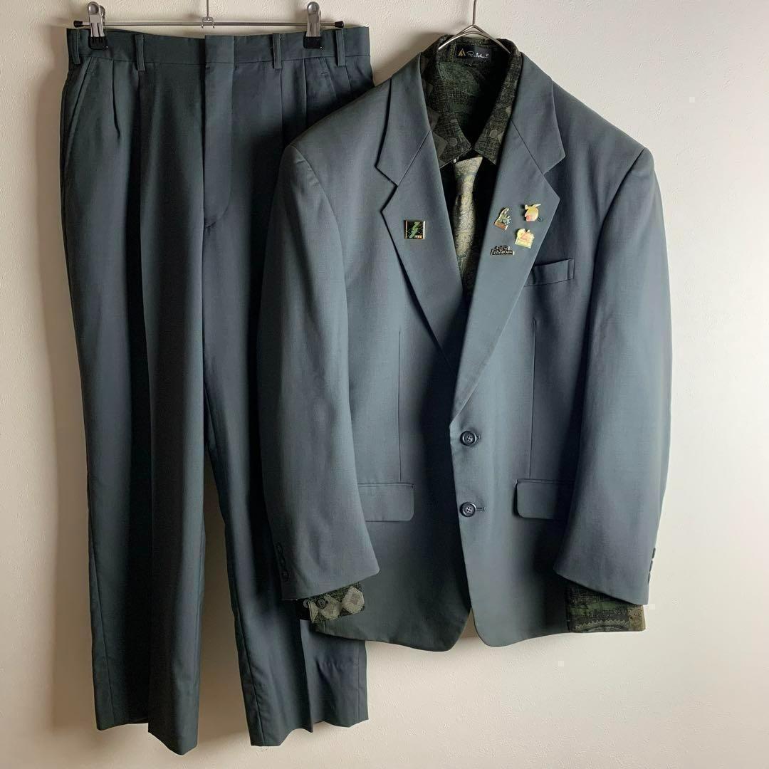 - コーデ売り セットアップ ダークグリーン シングル ピンズ 長袖シャツ ネクタイ 総柄 スーツ メンズ セレモニー ビジネス カジュアル 古着