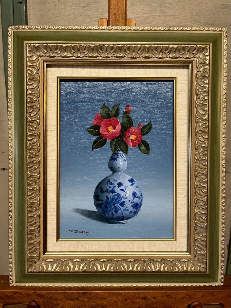 - 真作 酒井修一郎 『 椿 』 油彩 F4号 額装 絵画 油絵 静物画 GLC