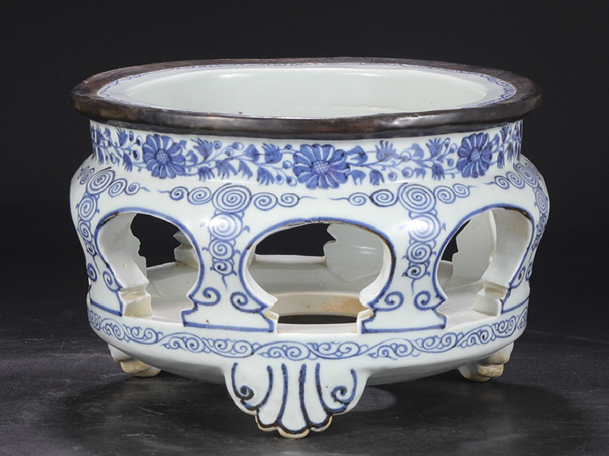 - ▽鴻▽元時代 陶磁器 青花鏤空彫纏枝花卉紋包銀口魚盆 共箱 時代物 中国古美術 骨董品